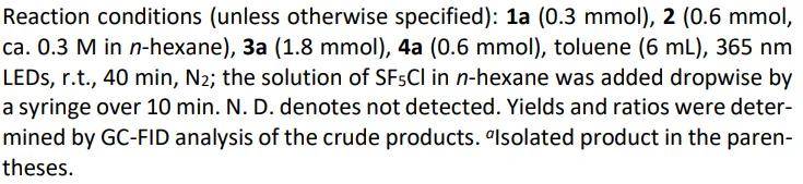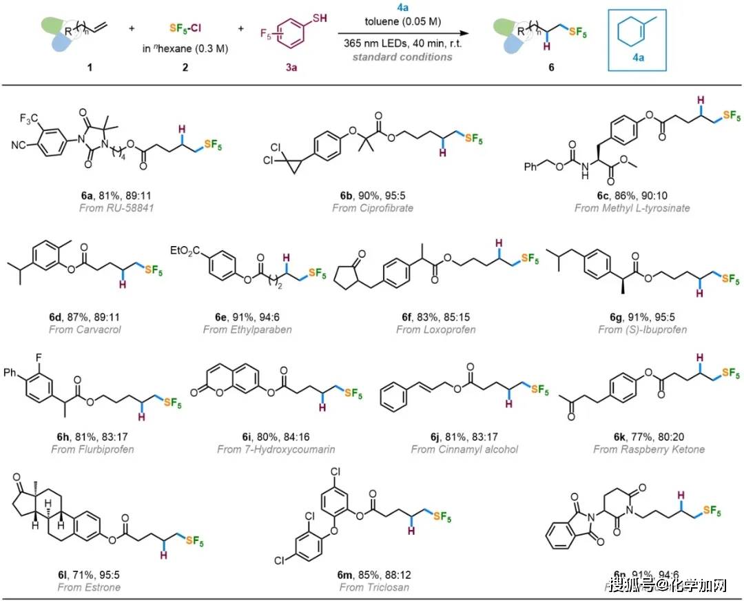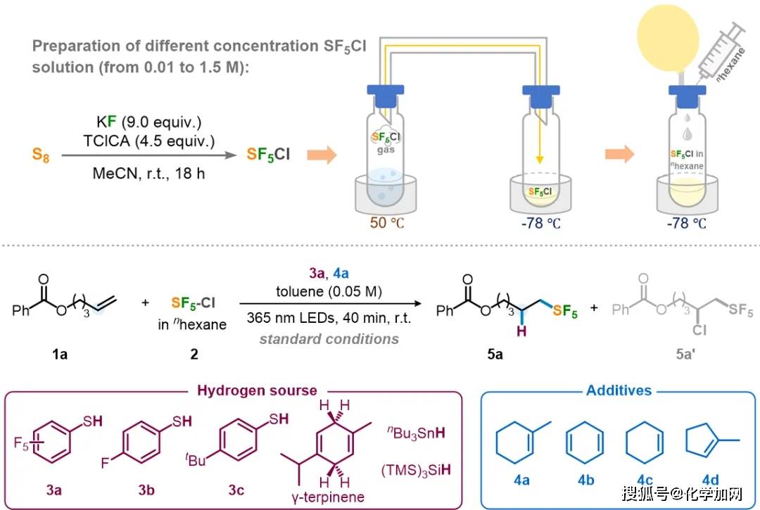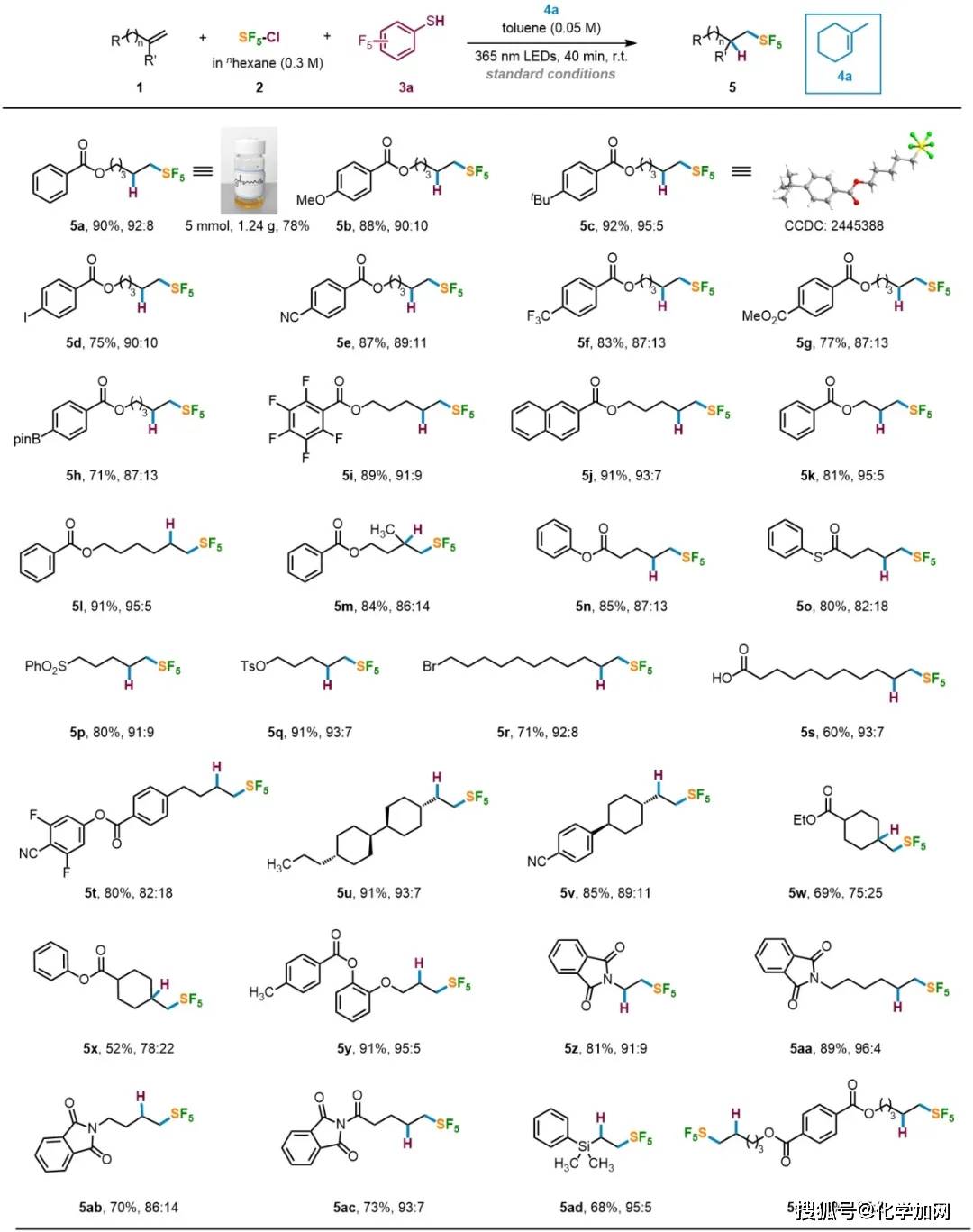 作者首先对五氟硫氯的合成进行了优化,使用如图装置可以获得最高1.5 M浓度的五氟硫氯,解决了先前浓度较低的问题。之后作者对烯烃的氢化五氟硫基化反应条件进行优化,作者发现在室温及365 nm LED光照条件下,以甲苯为溶剂,将非活化烯烃(1a)、SF5Cl(2)、五氟苯硫酚(3a,PFBT)和1-甲基环己烯(4a)共同反应,能以90%的分离收率获得具有良好化学选择性的氢化五氟硫基化产物5a。在不加入PFBT的条件下,仅分离得到原子转移自由基加成(ATRA)产物——氯五氟硫基化副产物5a′,表明PFBT是主要的氢原子供体。溶剂筛选结果显示,甲苯是最佳反应溶剂,而使用THF或乙腈时未观察到产物5a生成。此外,选用二氯甲烷或1,4-二氧六环作为溶剂会导致收率下降和化学选择性变差。与缓慢滴加SF5Cl溶液相比,快速一次性加入会显著提高氯五氟硫基化副产物5a′的生成量。自由基调控剂4a对抑制副产物5a′的形成具有关键作用;若不加入4a,5a与5a′会以接近1:1的比例同时生成。若换用其他调控剂,包括二取代烯烃(4b或4c)或五元环烯烃(4d),也能在一定程度上抑制5a′的生成,但效果均不如最优添加剂4a。