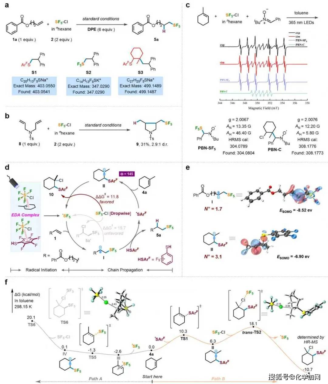 随后,作者进行了自由基捕获试验、量子产率测定、EPR实验、自由基钟实验等进一步对机理进行验证,并提出了反应过程可能存在的机理。该光诱导自由基反应通过一个精巧的“自由基调控”机制进行。反应始于EDA络合物生成SF5•自由基,其对烯烃加成形成碳自由基I;随后,芳基硫醇与I反应生成产物并释放出芳基硫自由基,后者与自由基调控剂甲基环己烯(4a)结合,生成关键的叔碳自由基中间体II。理论计算与实验数据共同表明,中间体II因其更高的反应活性,能优先与SF5Cl发生卤原子转移反应,这不仅再生了SF5•以维持链式循环,也有效抑制了中间体I的副反应路径。同时,甲基环己烯通过可逆捕获SF5•并设置动力学瓶颈,精准地调控了自由基的流向与浓度。这种通过调控剂与反应条件对自由基行为进行的协同调控,最终将潜在混乱的反应空间转化为一道高度有序、选择性的高效合成路径。