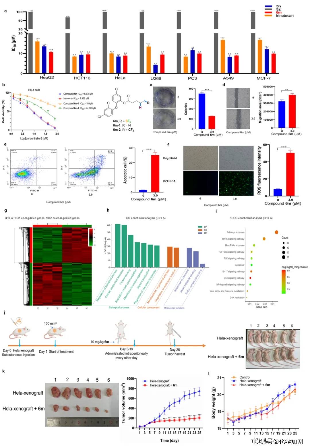 最后,化合物6m在体外抗癌实验中表现出优异活性,优于临床药物伊立替康;一系列的机制研究表明,该化合物具有潜在的抗肿瘤活性,这一发现为含SF5基团的抗癌药物研发提供了重要线索。