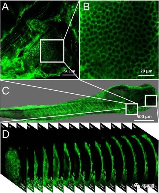 图3. (A) 活体斑马鱼腮部的荧光图;(B)活体斑马鱼腮部的局部放大图;(C)活体斑马鱼整体染色的荧光图;(D)活体斑马鱼眼部0-26微米的Z轴层扫荧光图。比例尺:(A, D) 50微米,(B) 20微米,(C) 500微米。